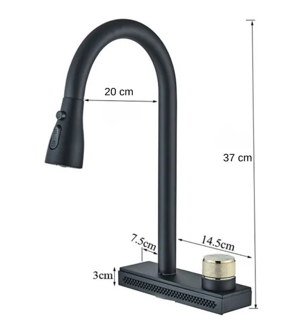 Baterie chiuveta bucatarie, Dus extractabil, 3 Functii de curge si mod Rainfall, Culoare negru mat, Dimensiune 37 cm