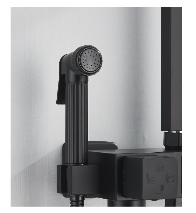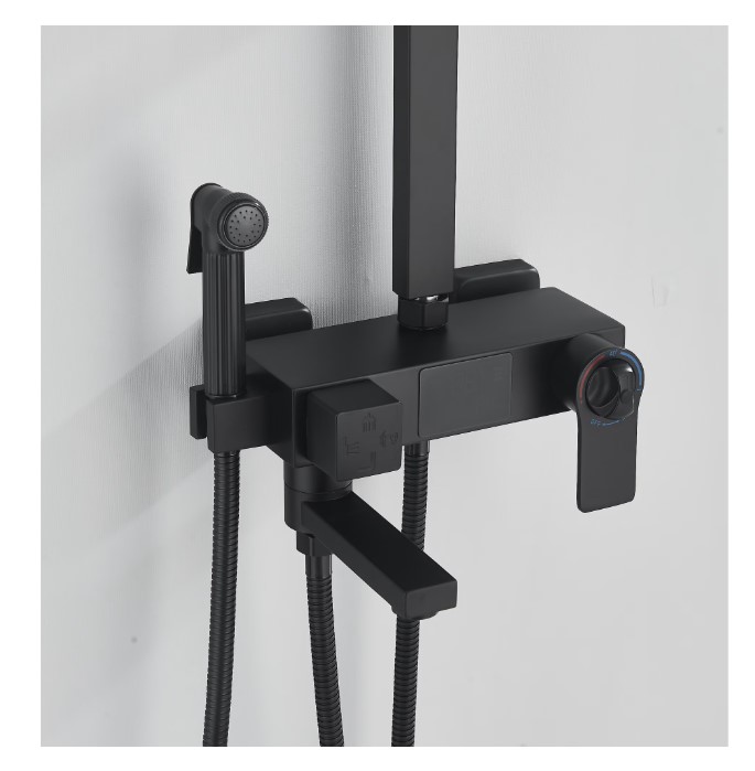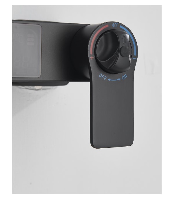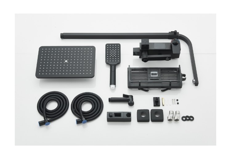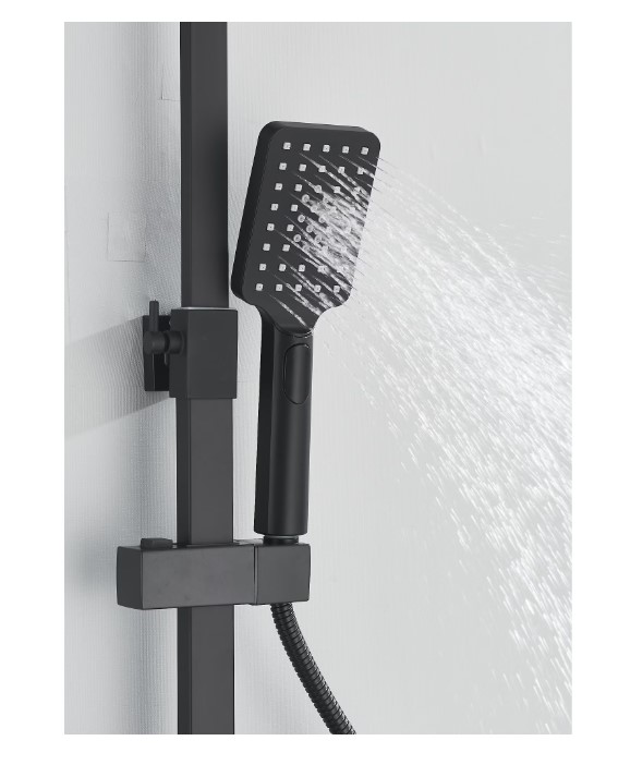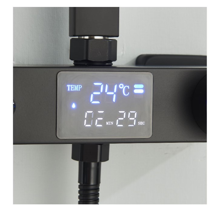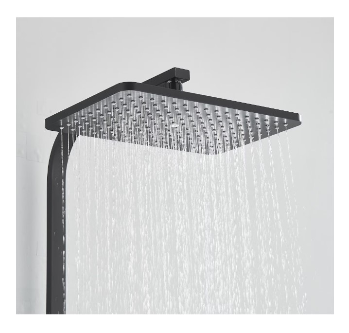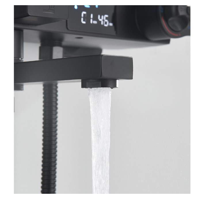 Coloana de Dus Baie, Termostat Temperatura Apa, Reglabila pe Inaltime, Display LCD, Cos Organizator, Culoare Negru Mat, Palarie Dus 30×30 cm cu Efect Ploaie, 4 Functii de Curgere
