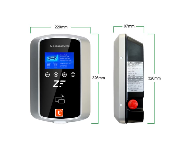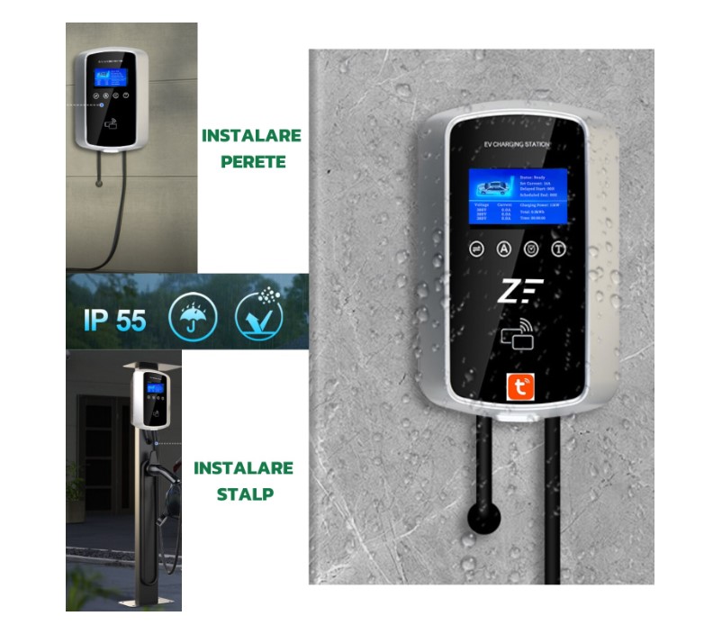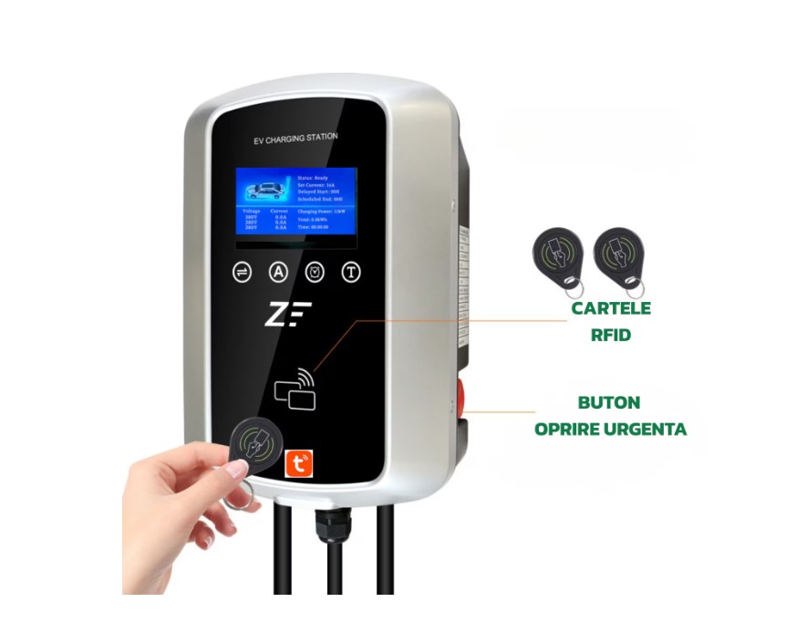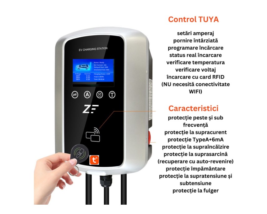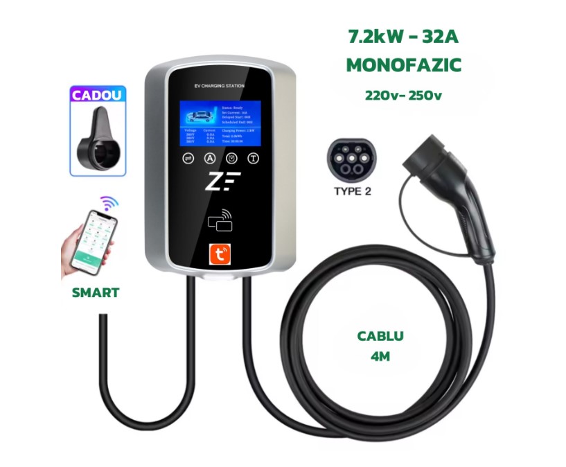 Statie de incarcare perete/stalp Smart, 220V, Tuya, masina electrica/hybrid, 7, 2KW cu limitator de putere 8-10-13-16-32A TYPE 2, display cu temporizare, RFID card
