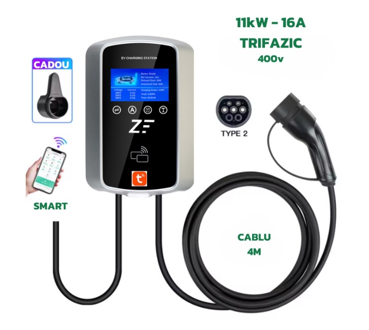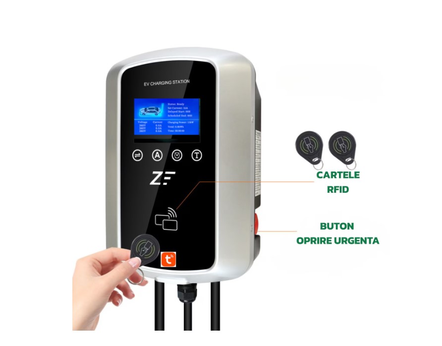 Statie de incarcare perete/stalp Smart, 380V, Tuya, masina electrica/hybrid, 11KW cu limitator de putere 8-10-13-16-32A TYPE 2, display cu temporizare, RFID card