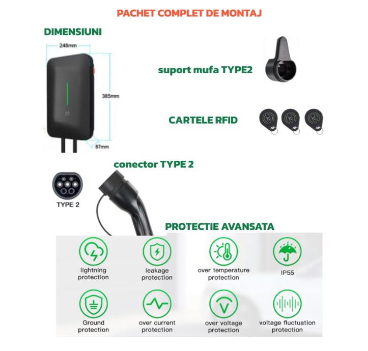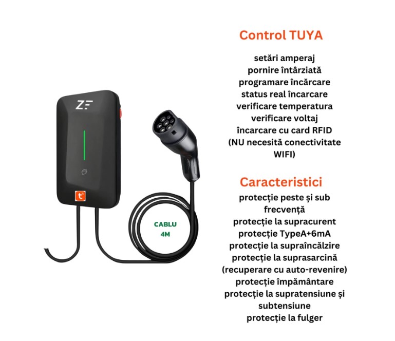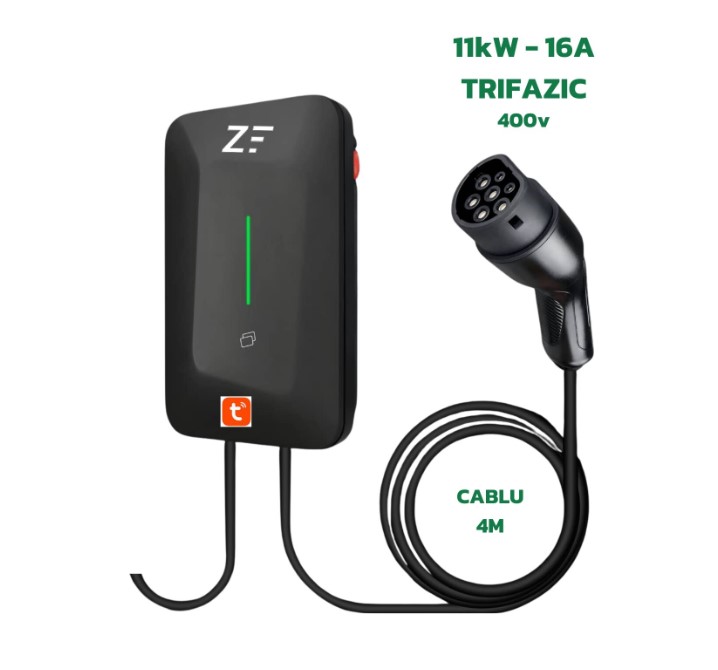 Statie de incarcare perete/stalp Smart fara display, 380V, Tuya, masina electrica/hybrid, 11KW cu limitator de putere 8-10-13-16A TYPE 2, si cu temporizare, RFID card